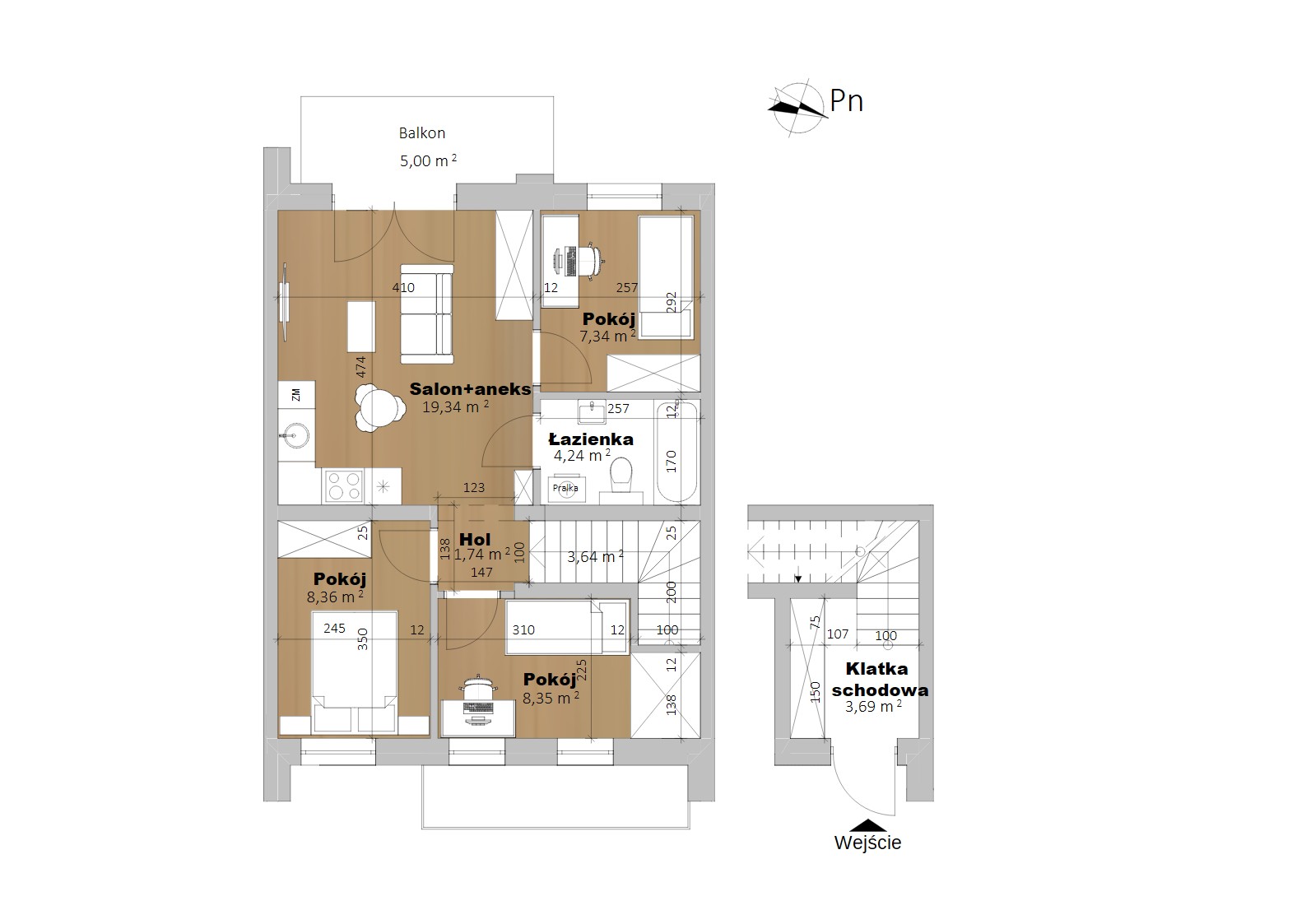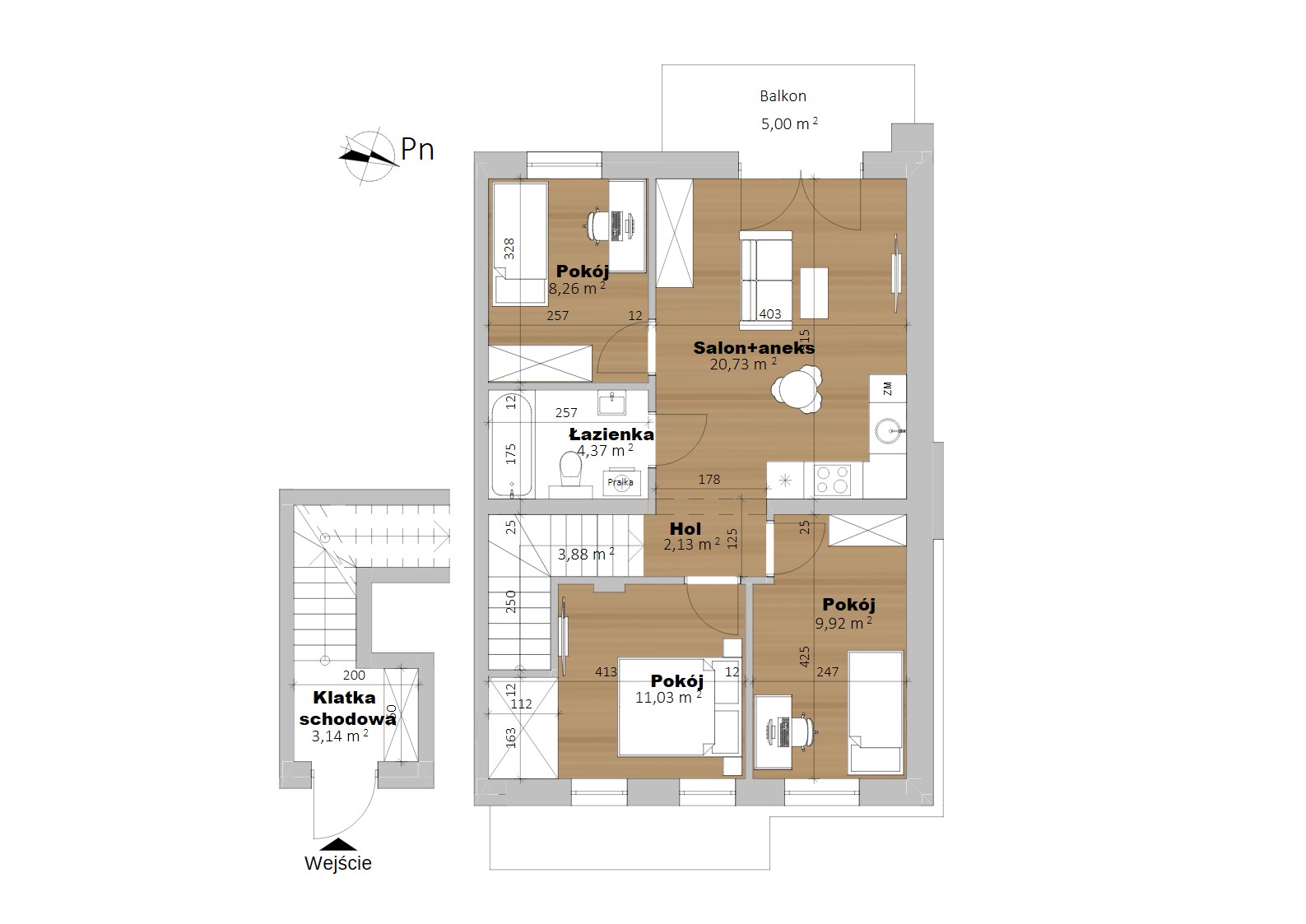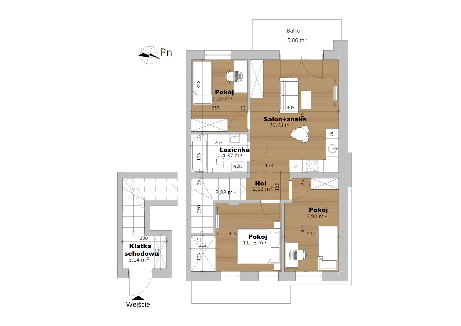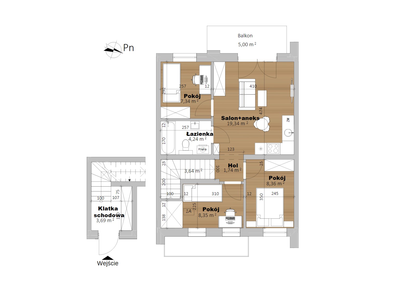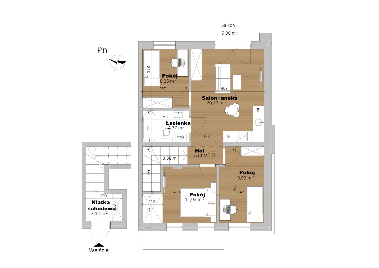 • możliwość elastycznej zmiany układu pomieszczeń z 4-pokojowego na 3-pokojowy