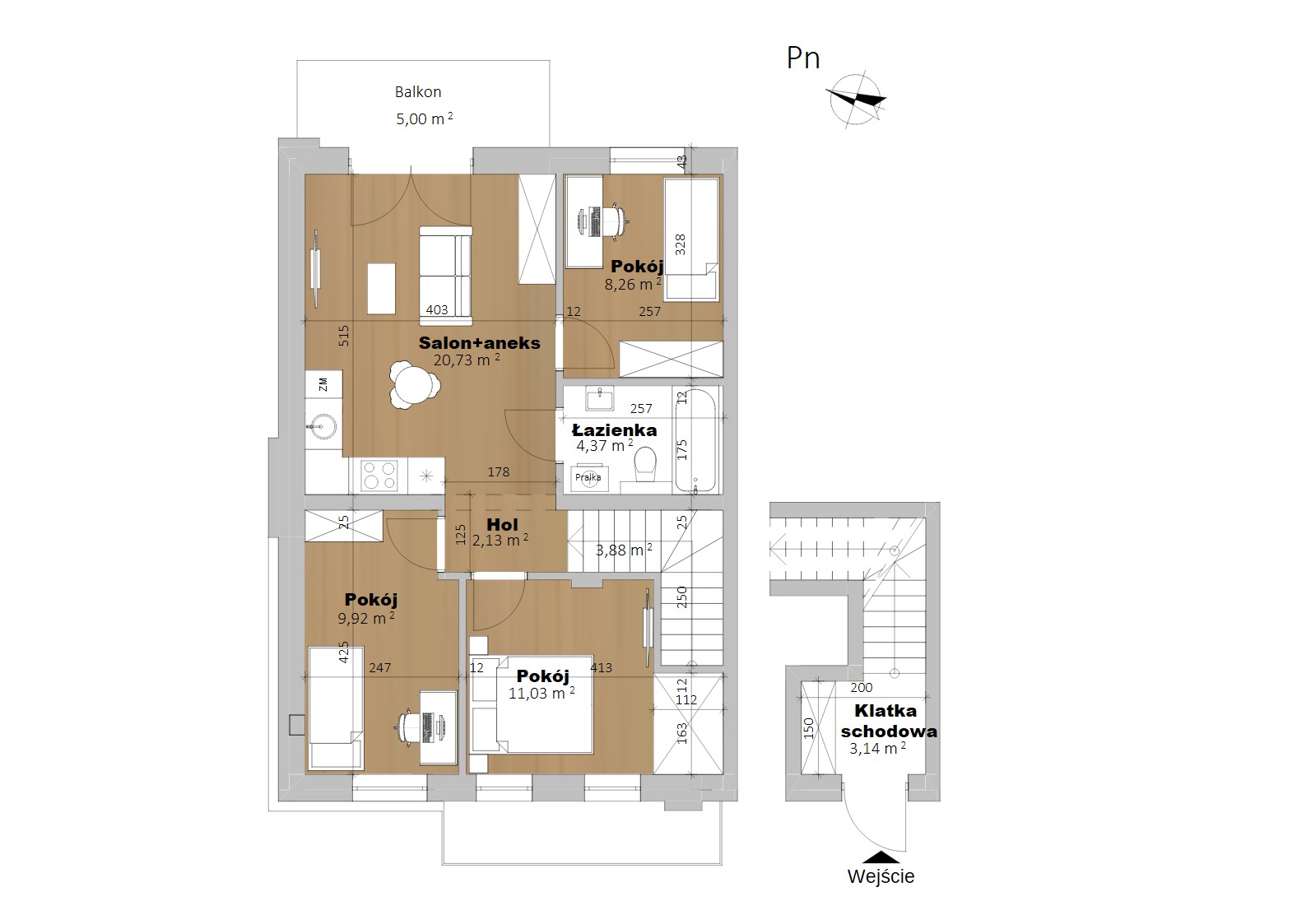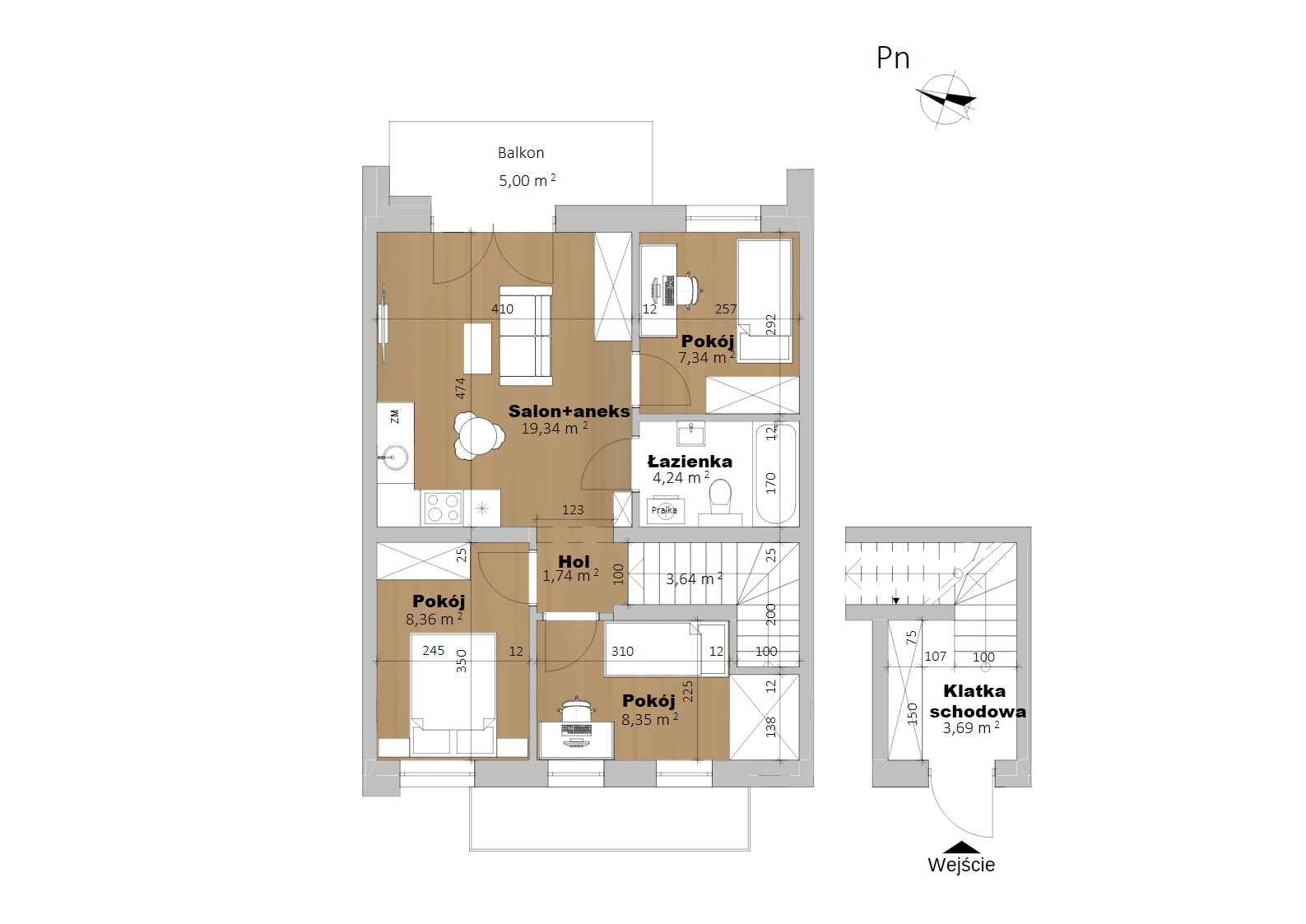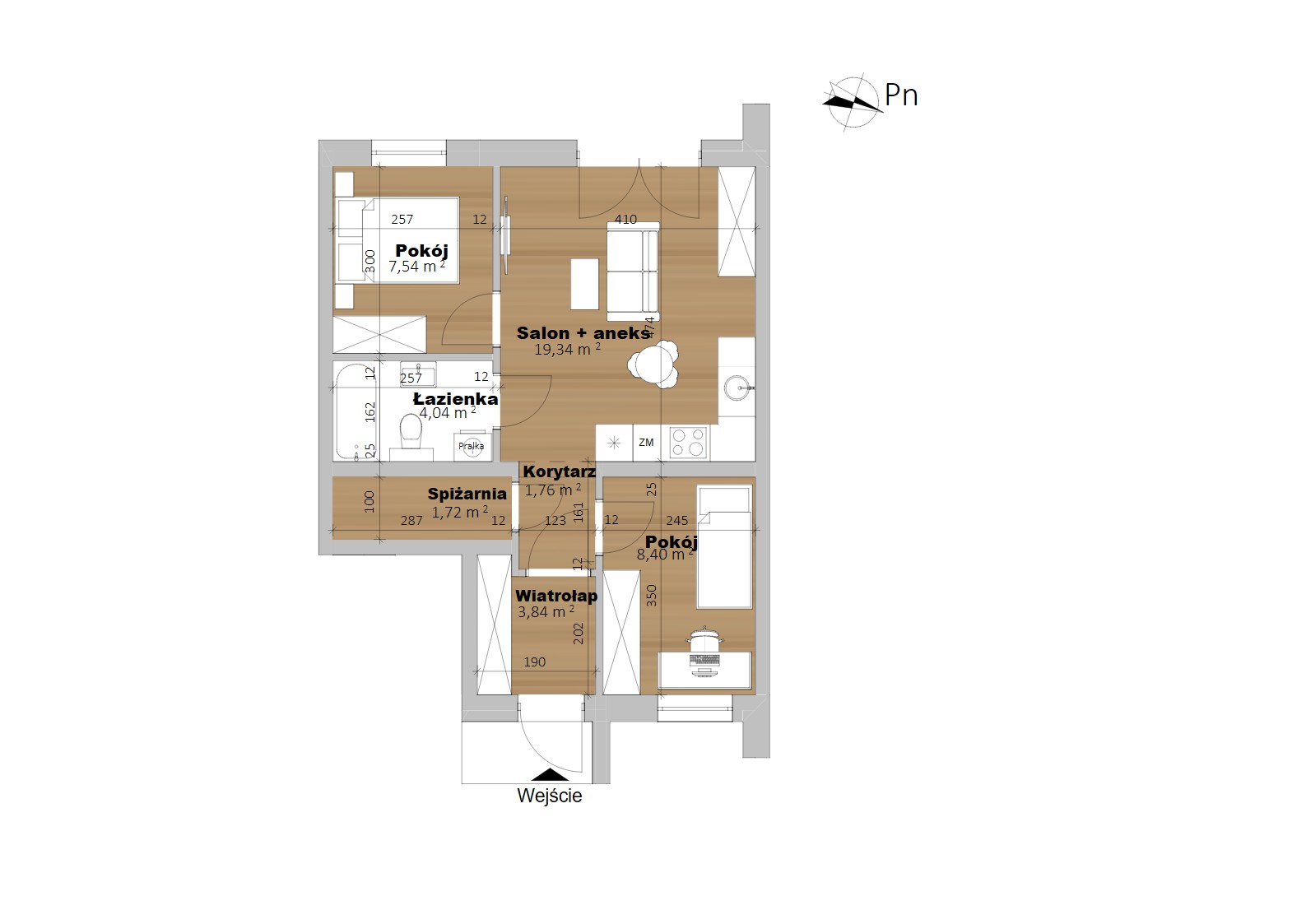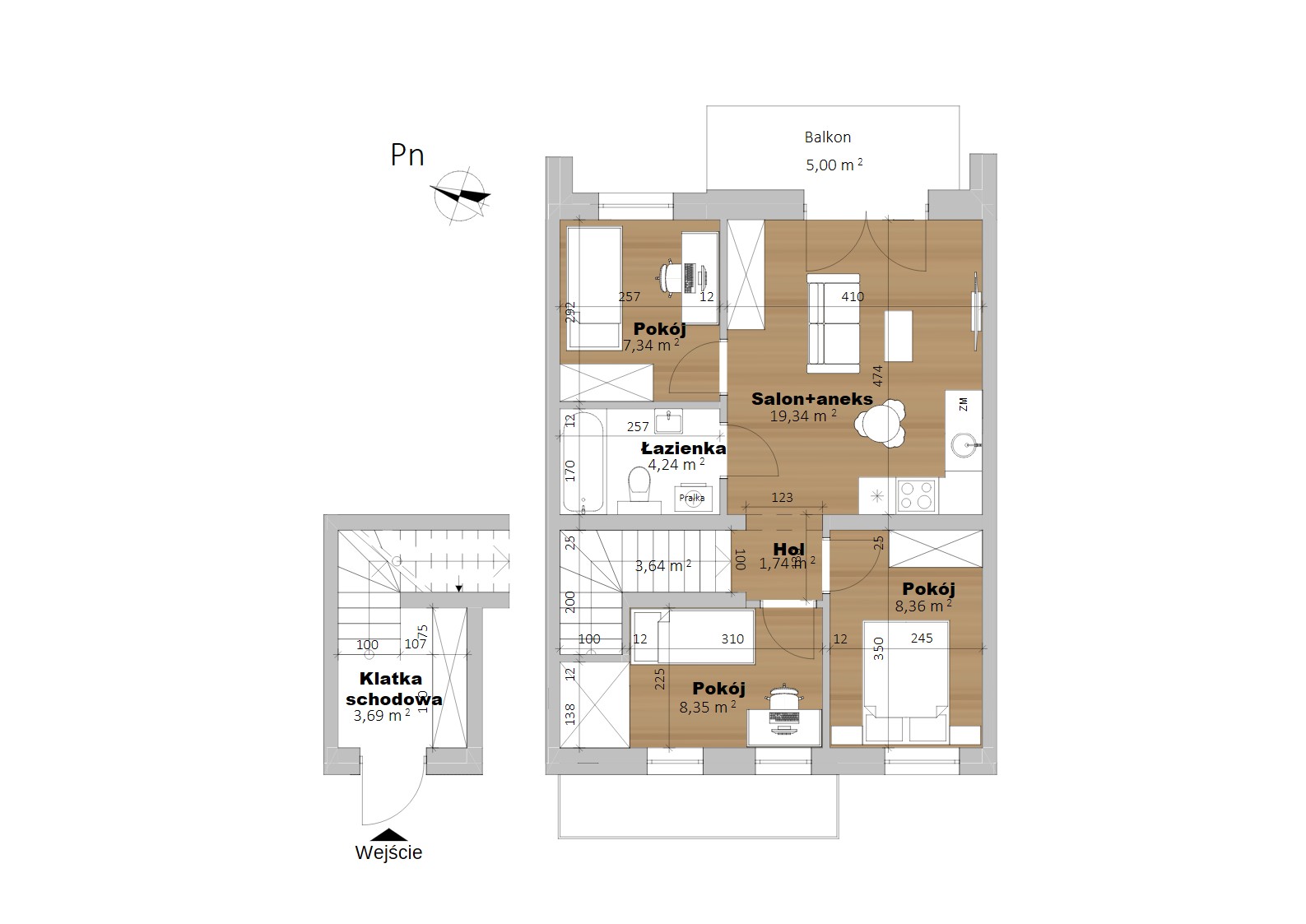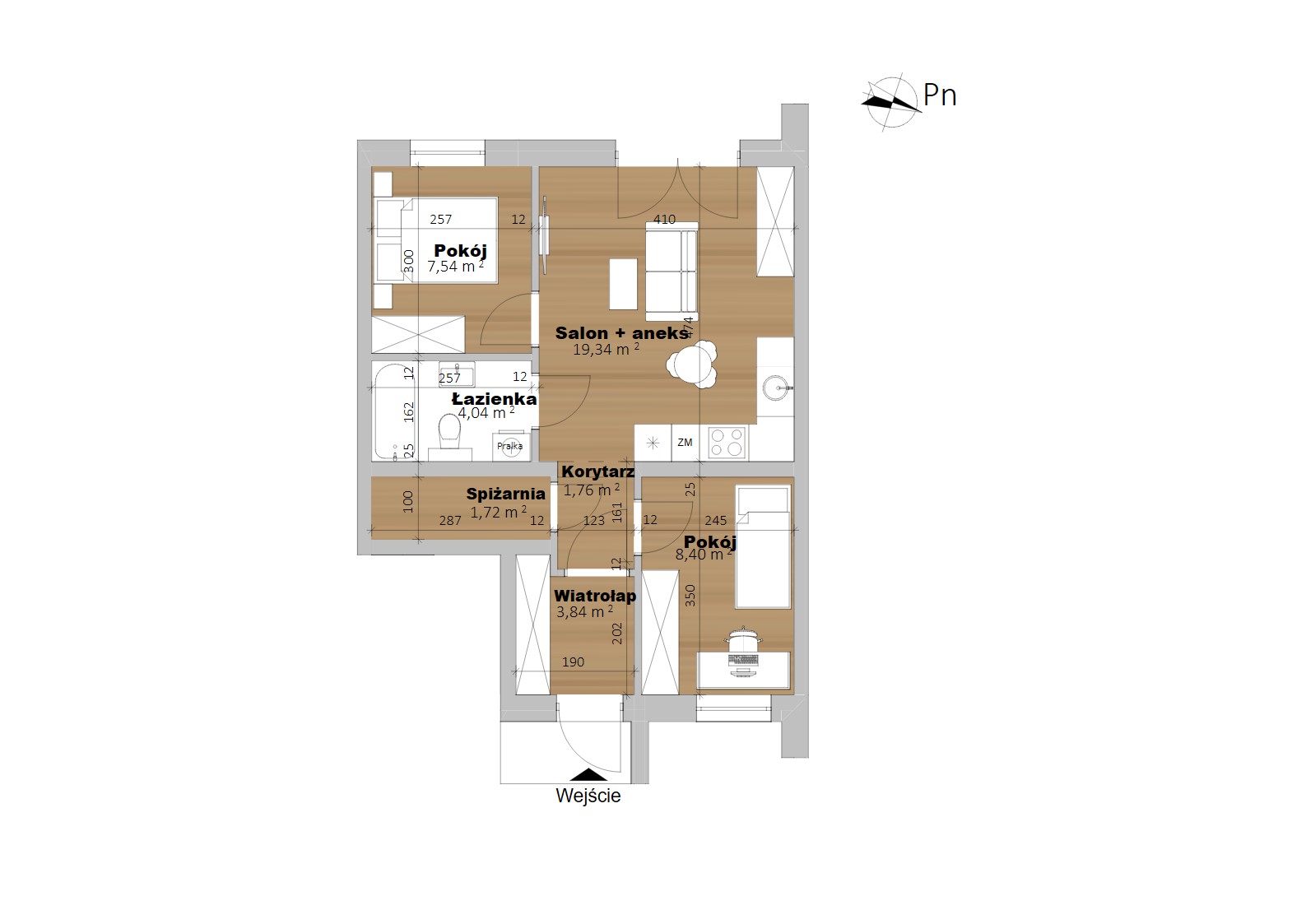 • możliwość elastycznej zmiany układu pomieszczeń z 4-pokojowego na 3-pokojowy