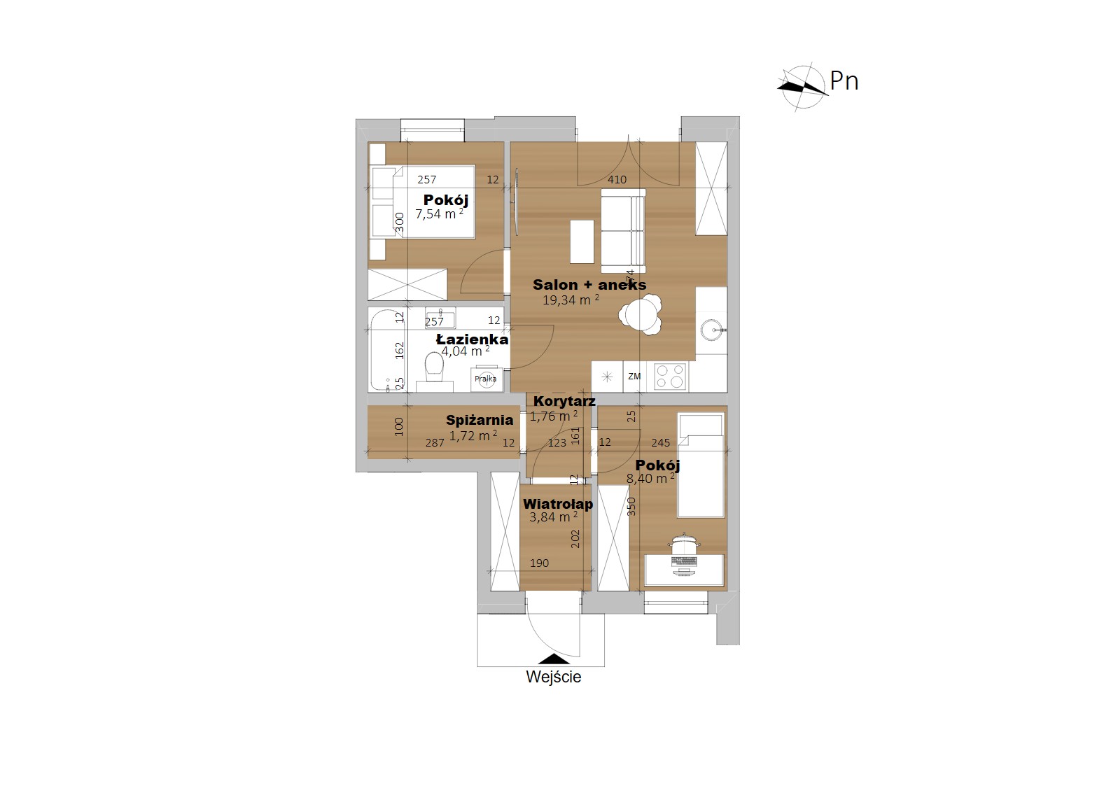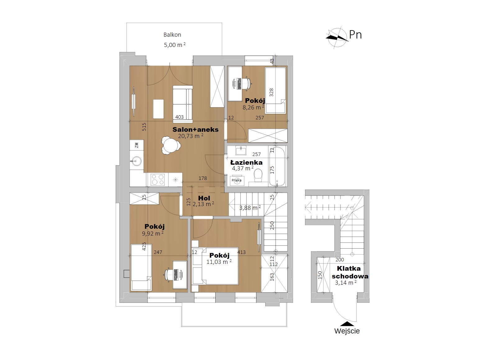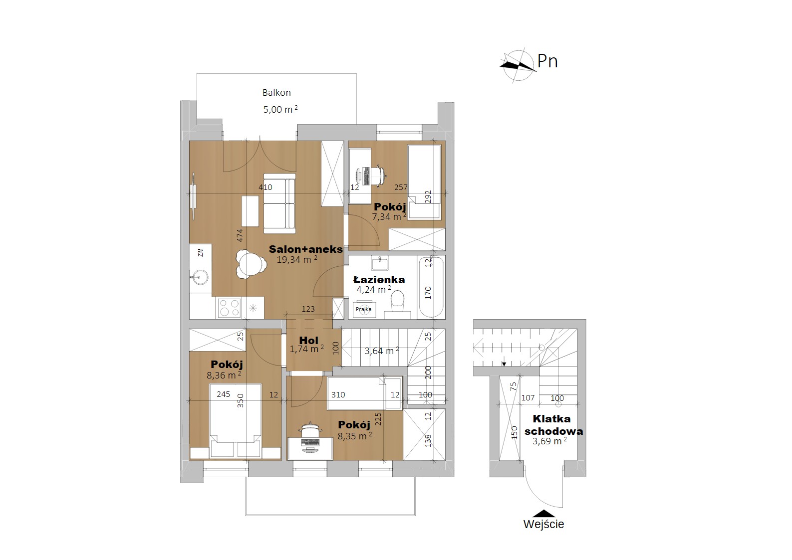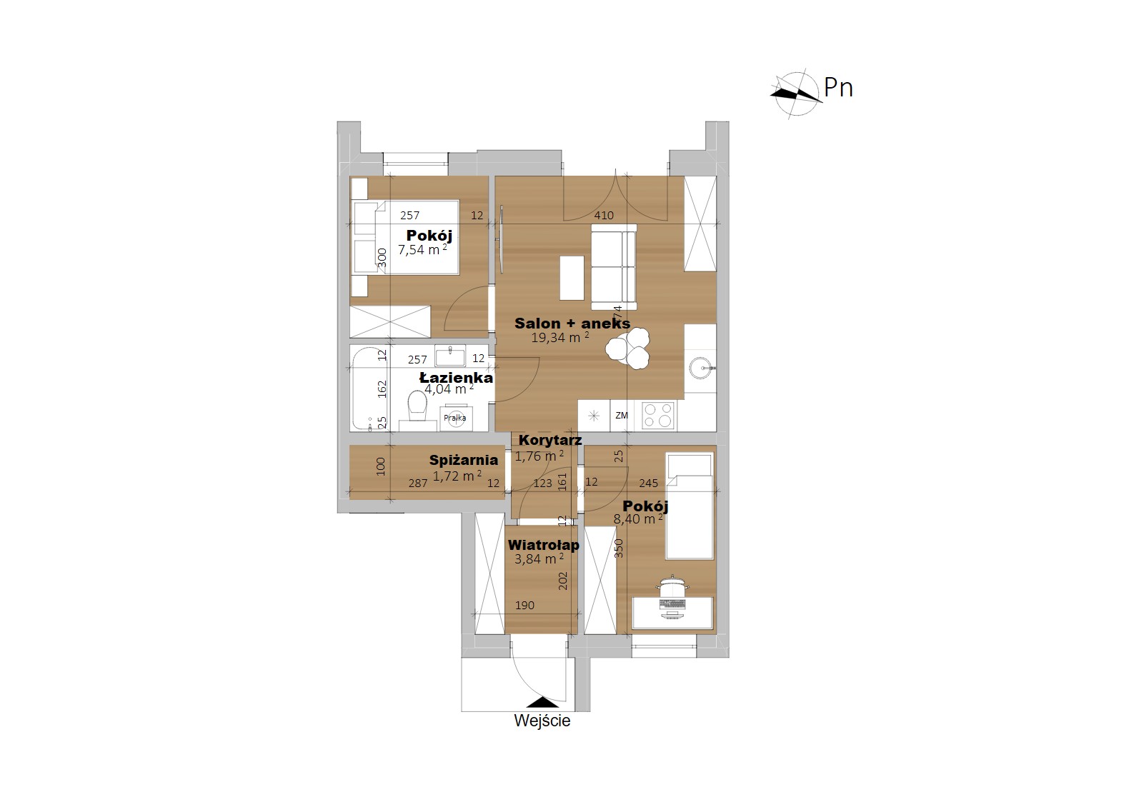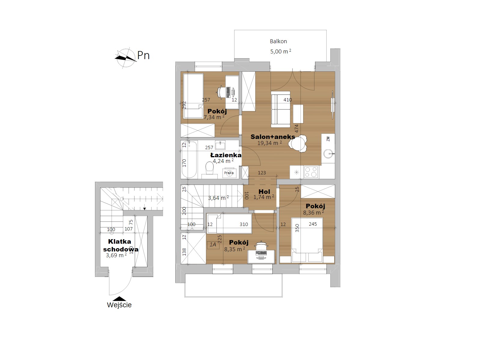 • możliwość elastycznej zmiany układu pomieszczeń z 4-pokojowego na 3-pokojowy
