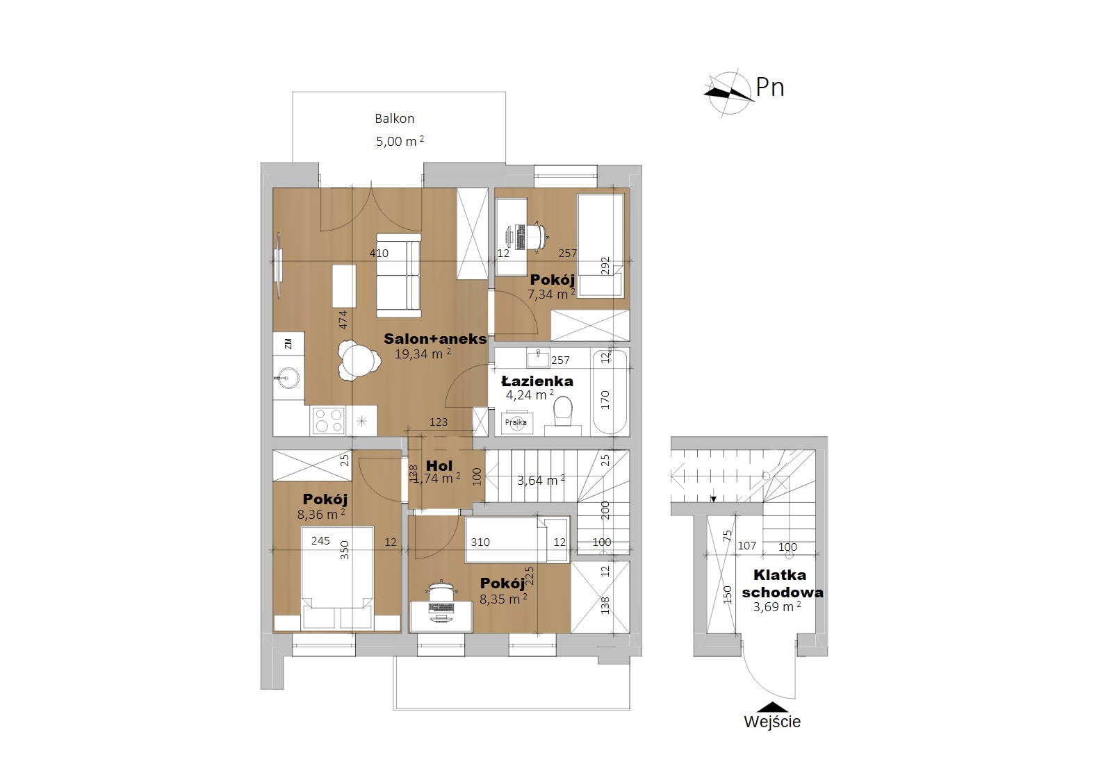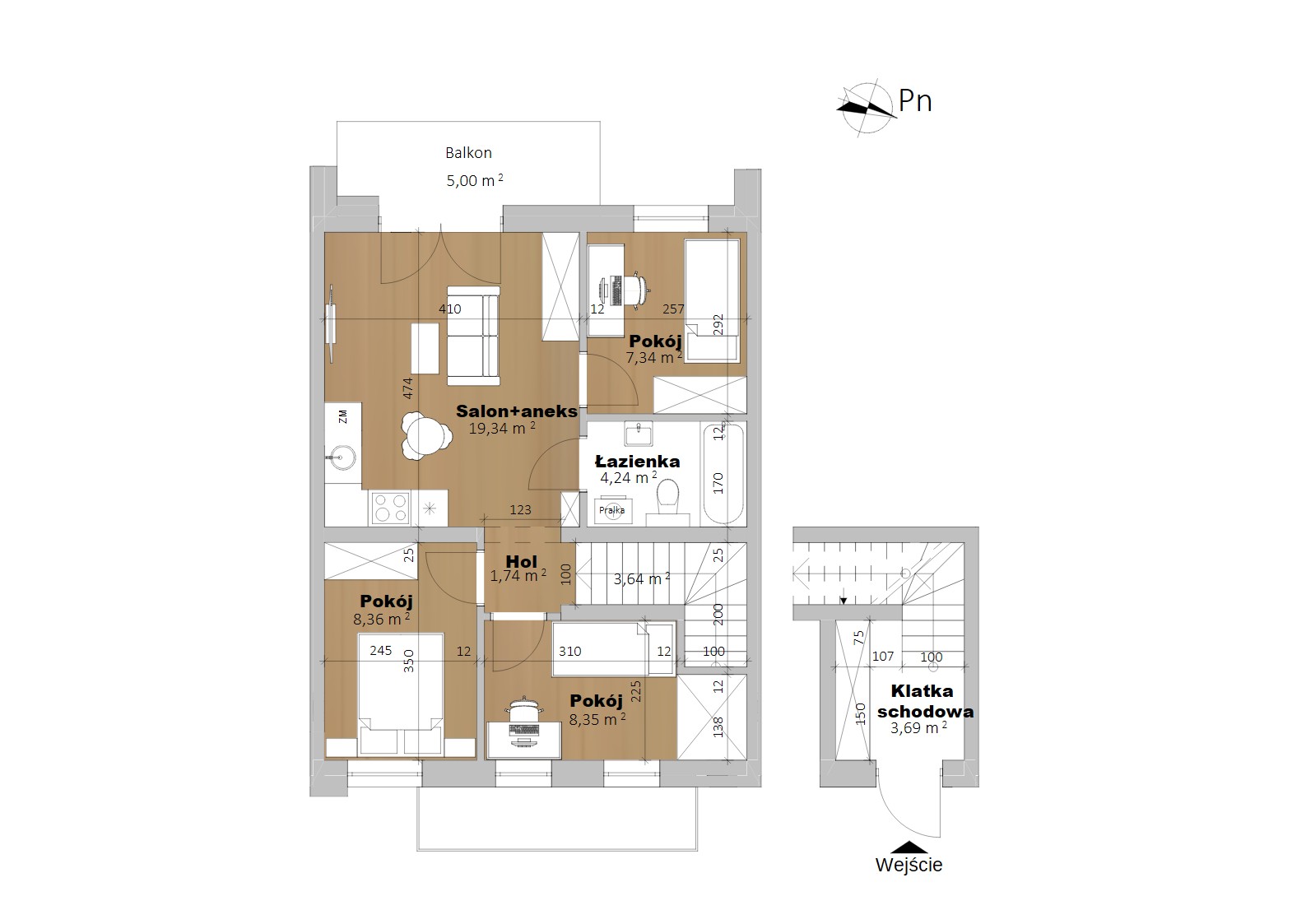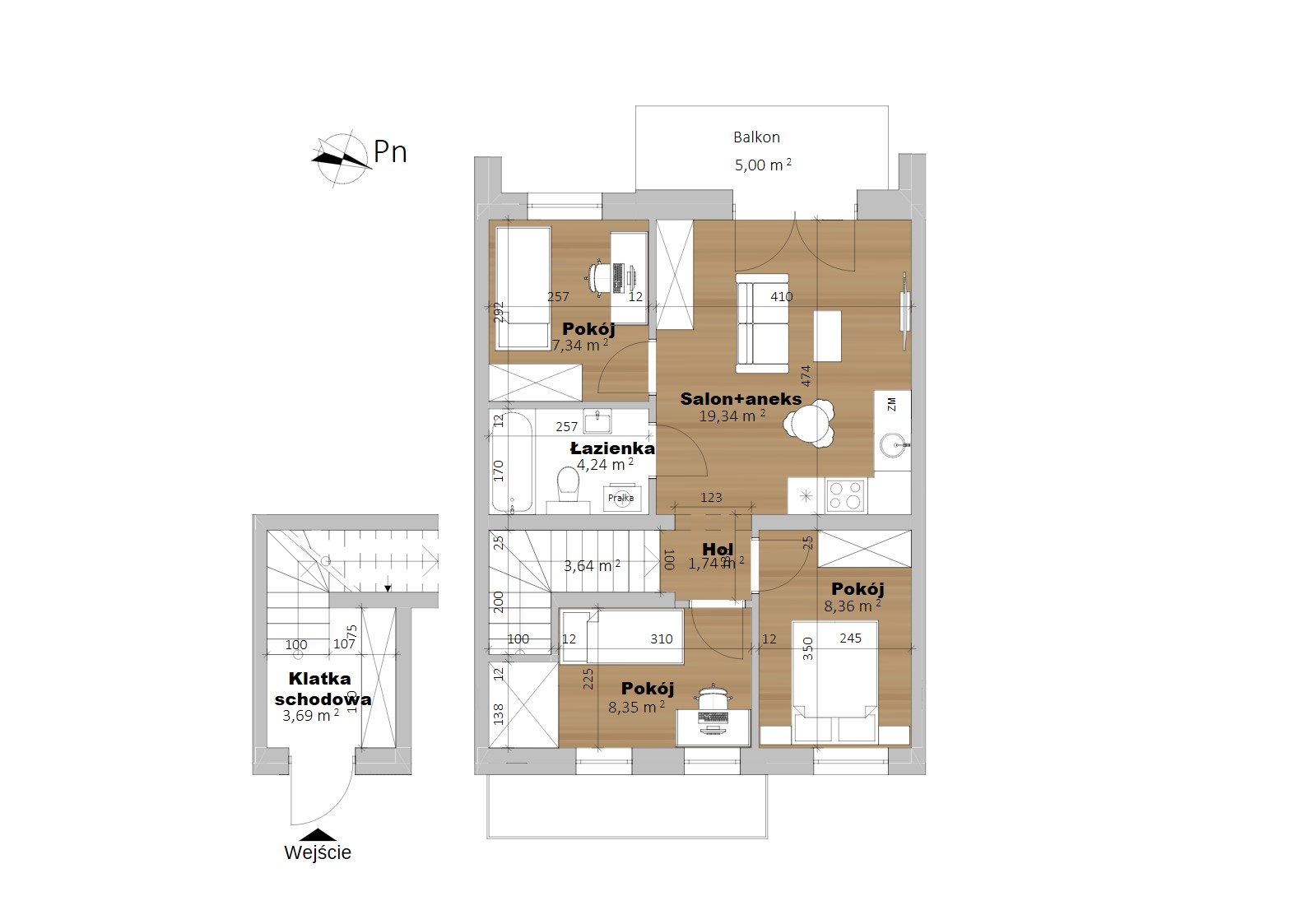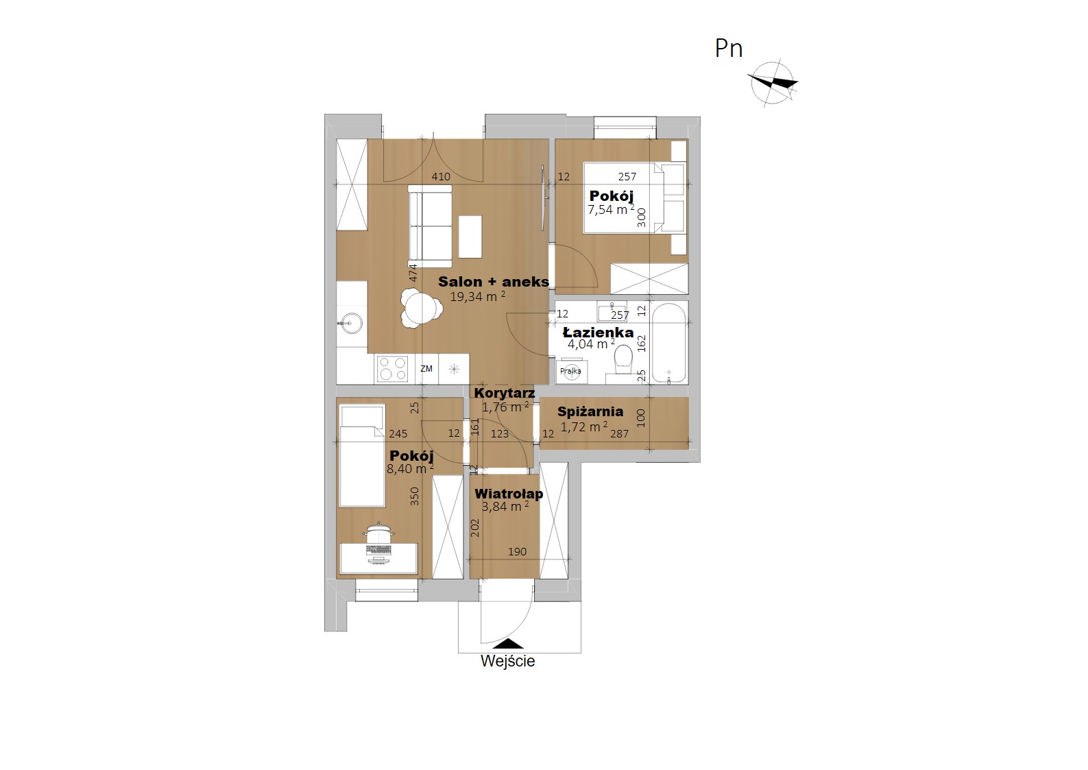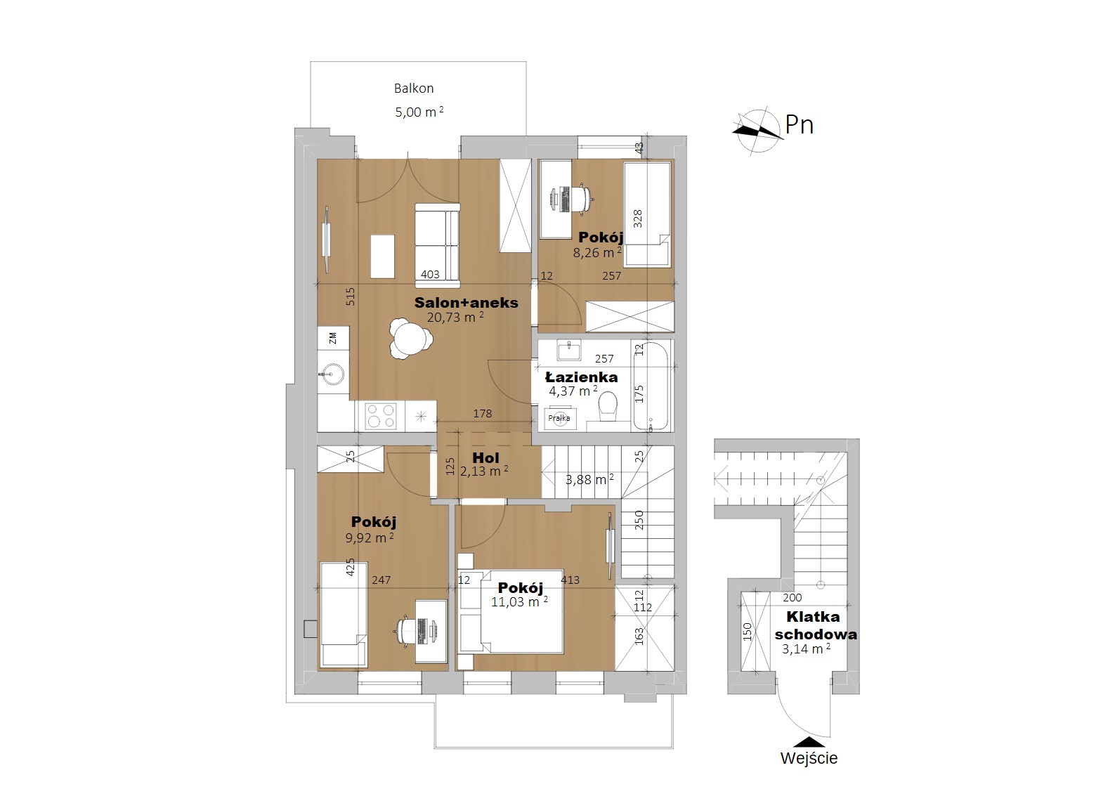 • możliwość elastycznej zmiany układu pomieszczeń z 4-pokojowego na 3-pokojowy