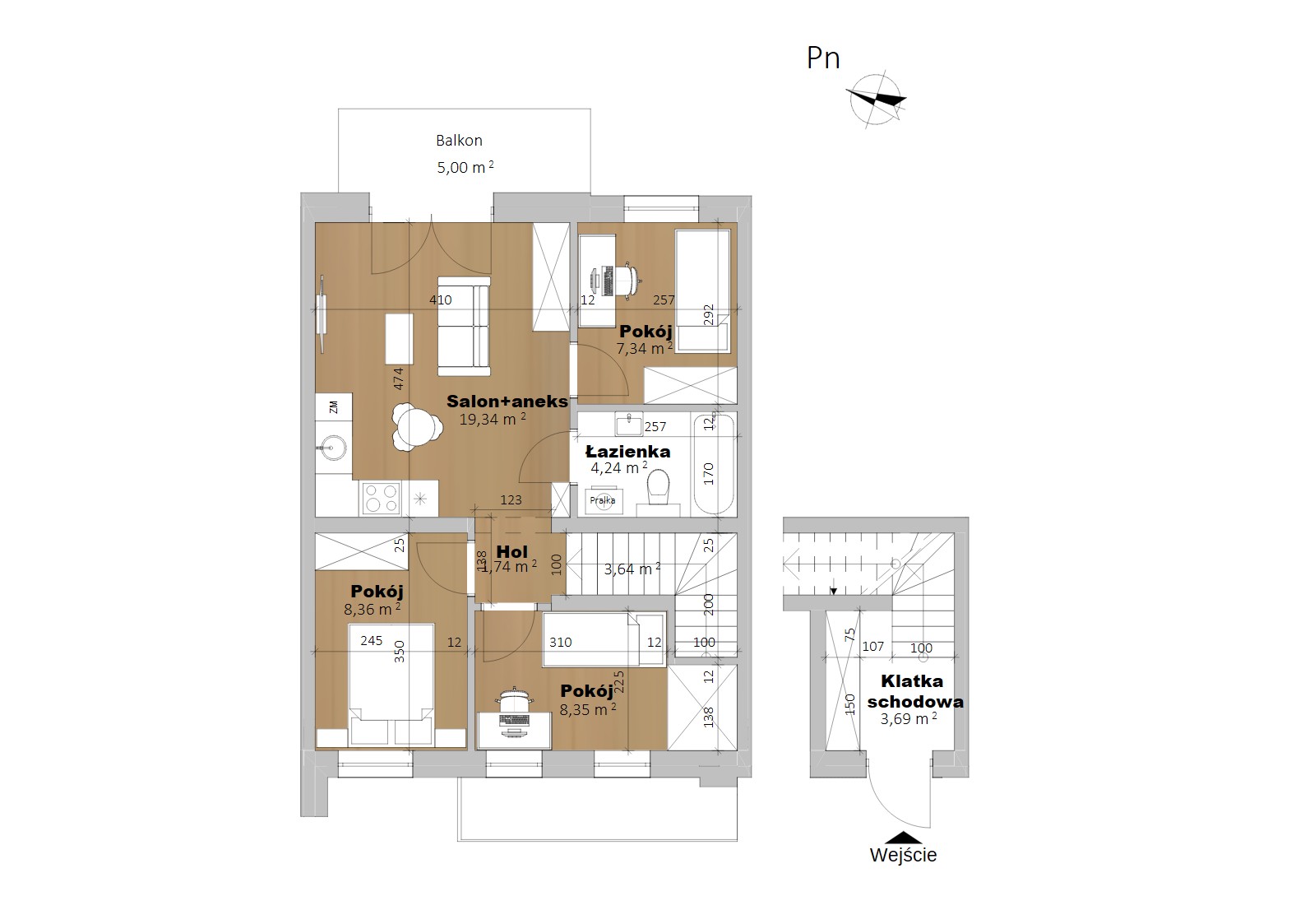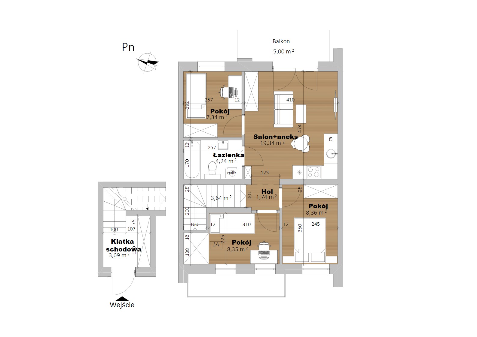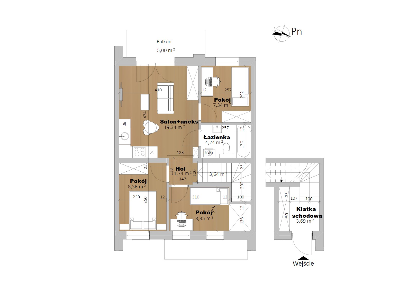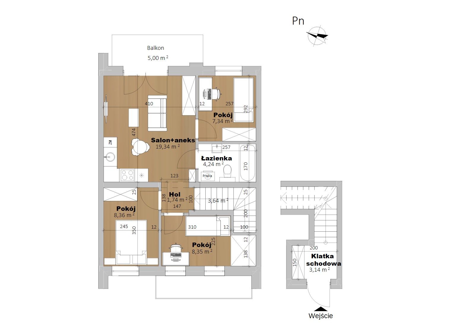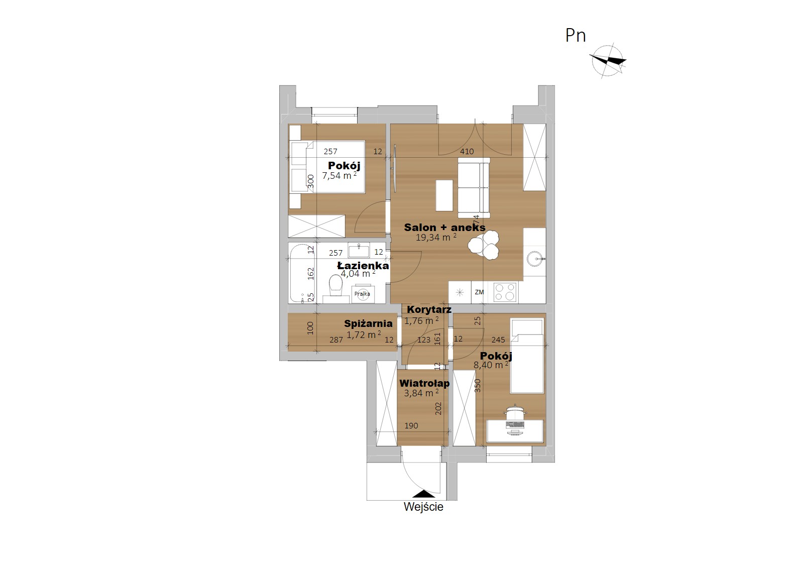 • możliwość elastycznej zmiany układu pomieszczeń z 4-pokojowego na 3-pokojowy