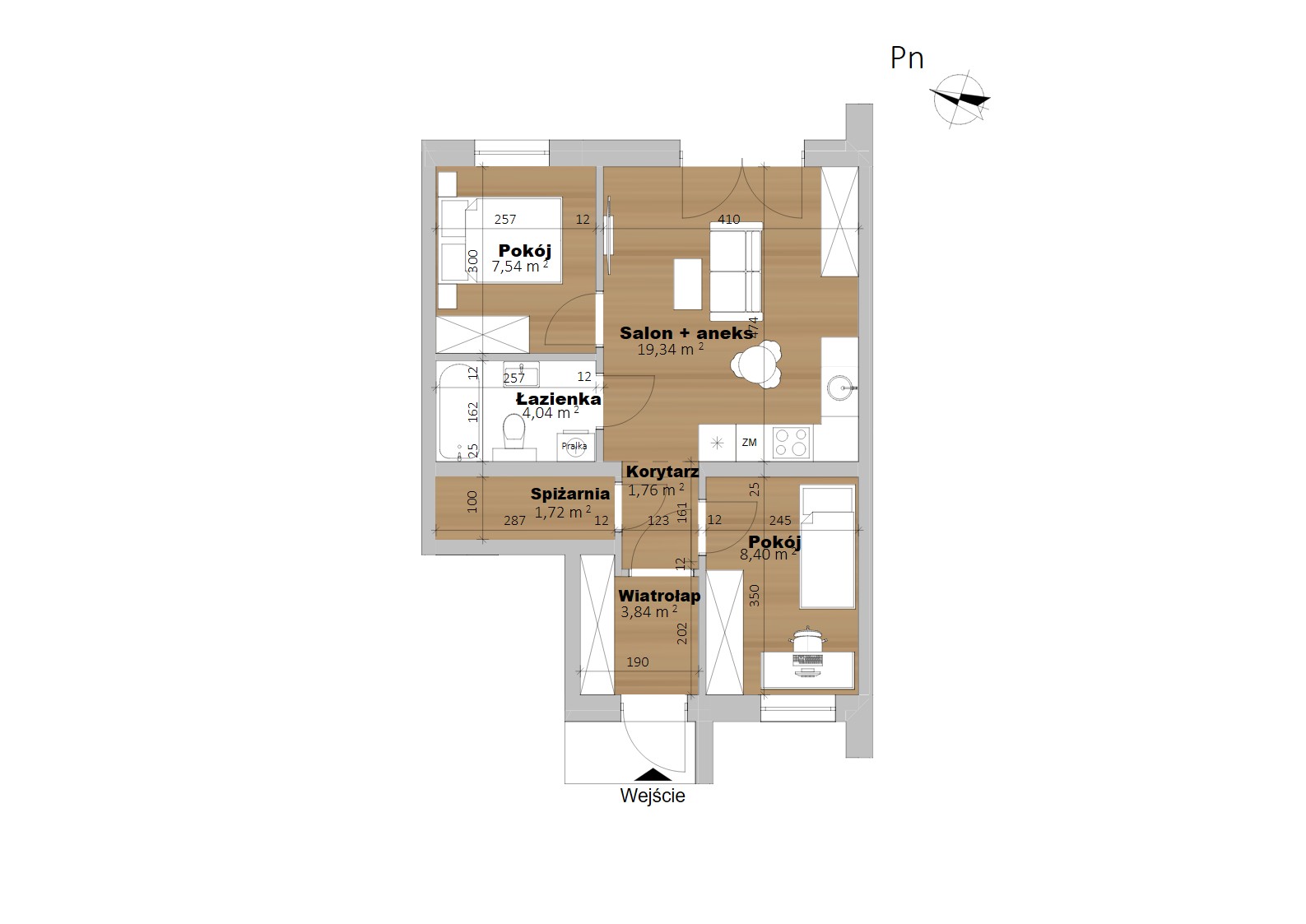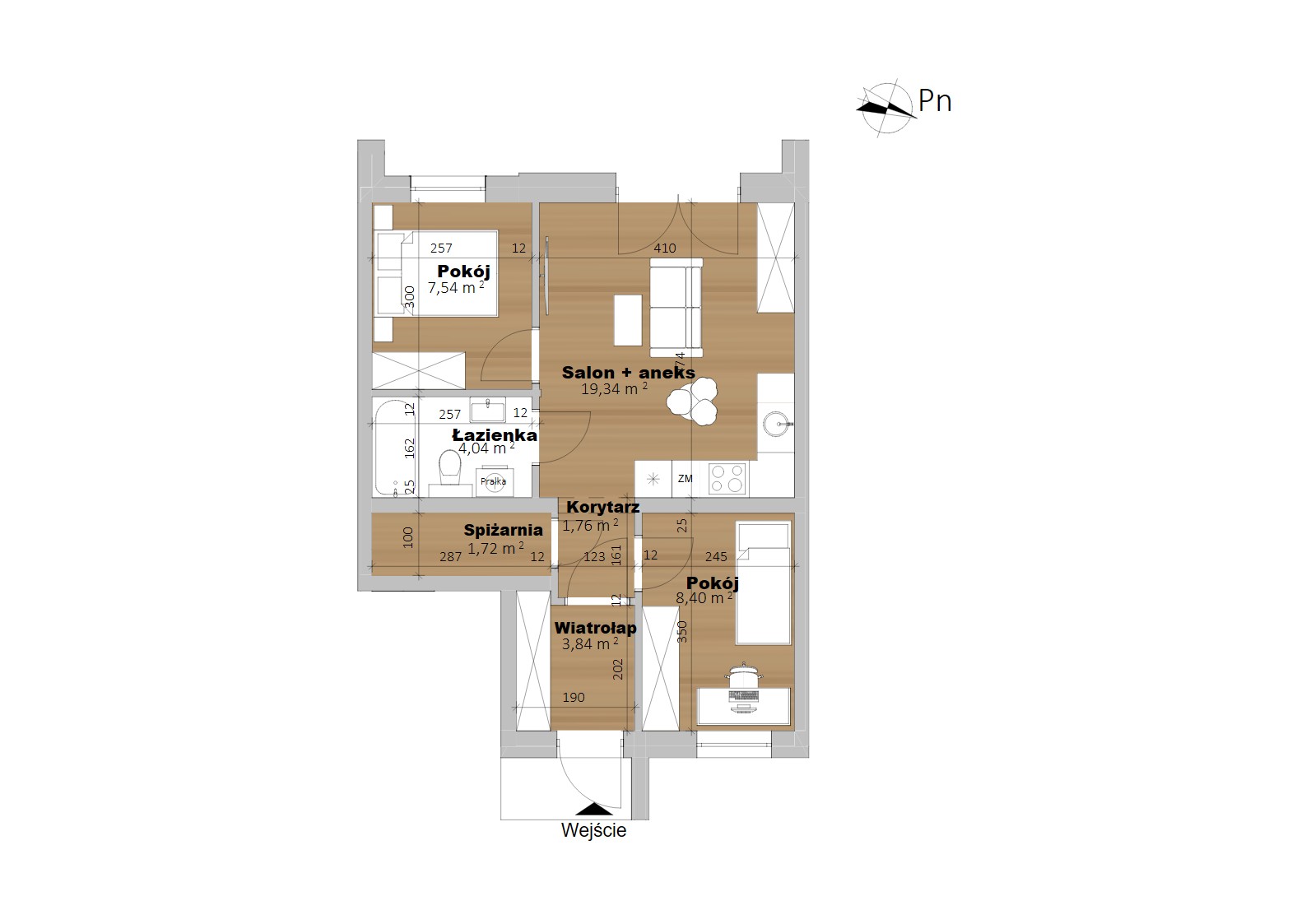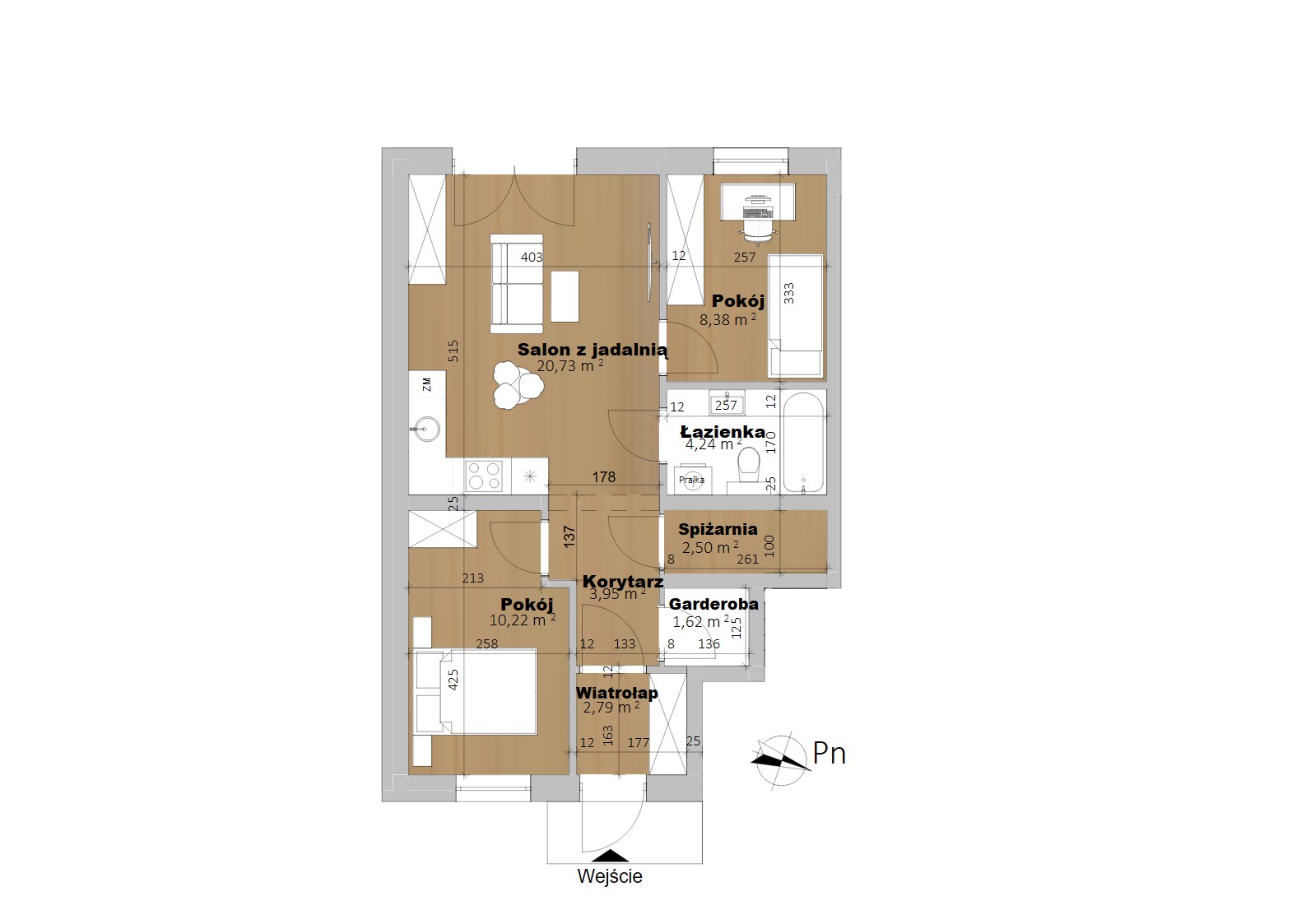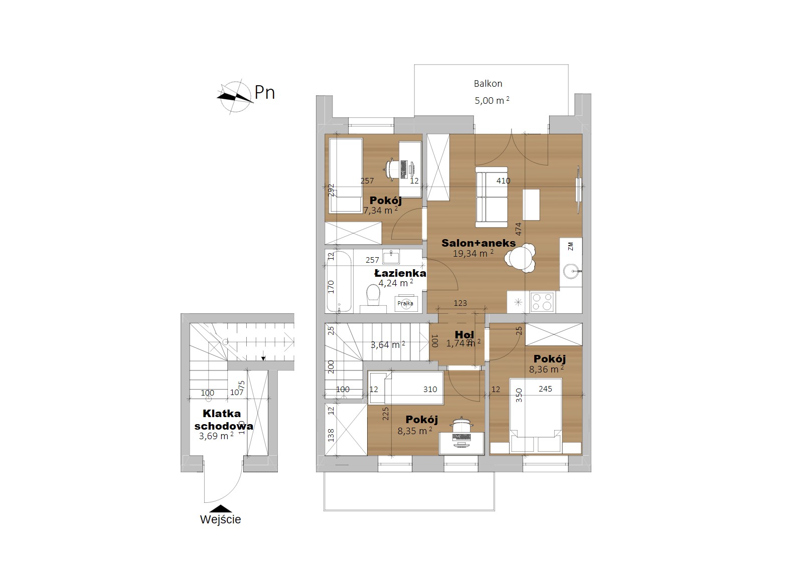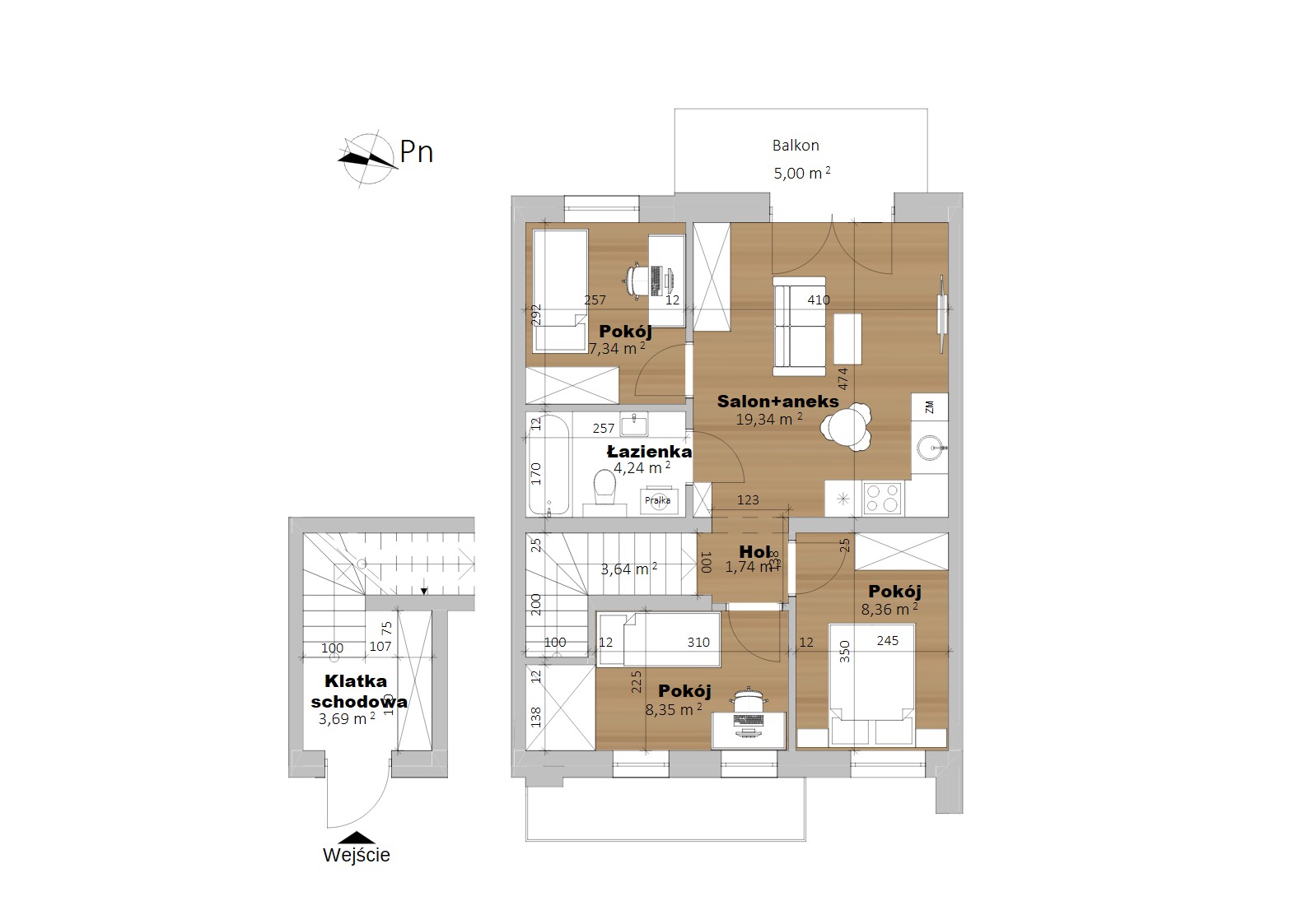 • możliwość elastycznej zmiany układu pomieszczeń z 4-pokojowego na 3-pokojowy