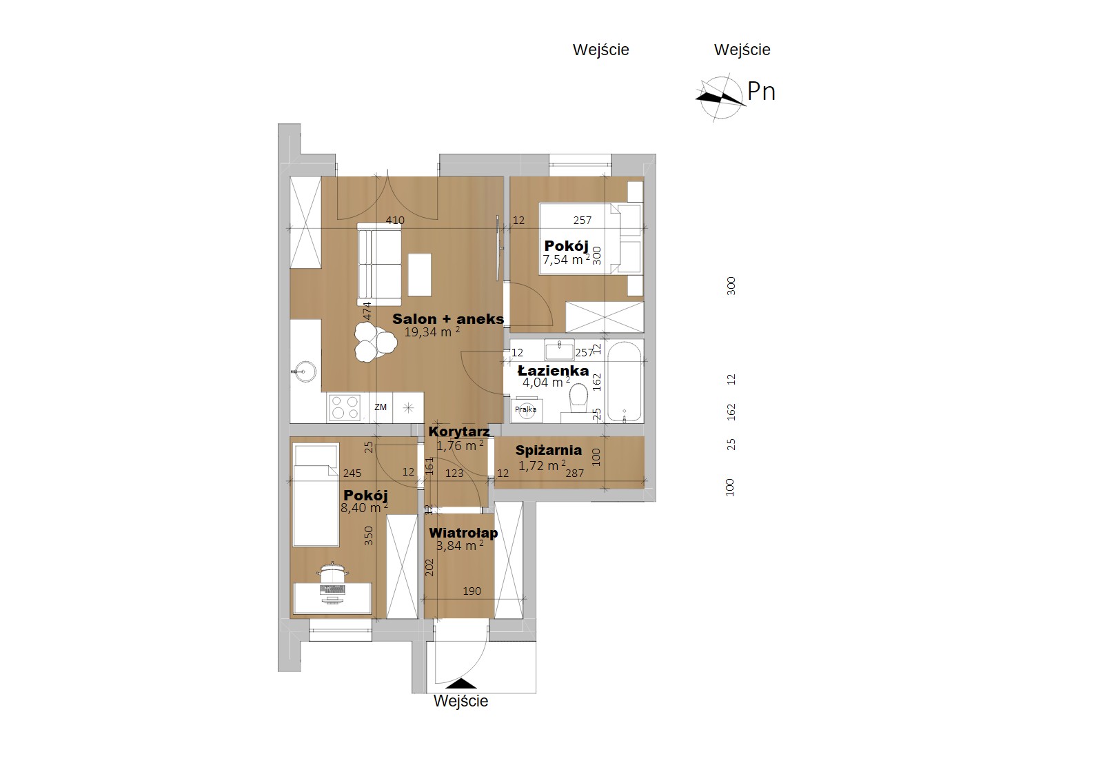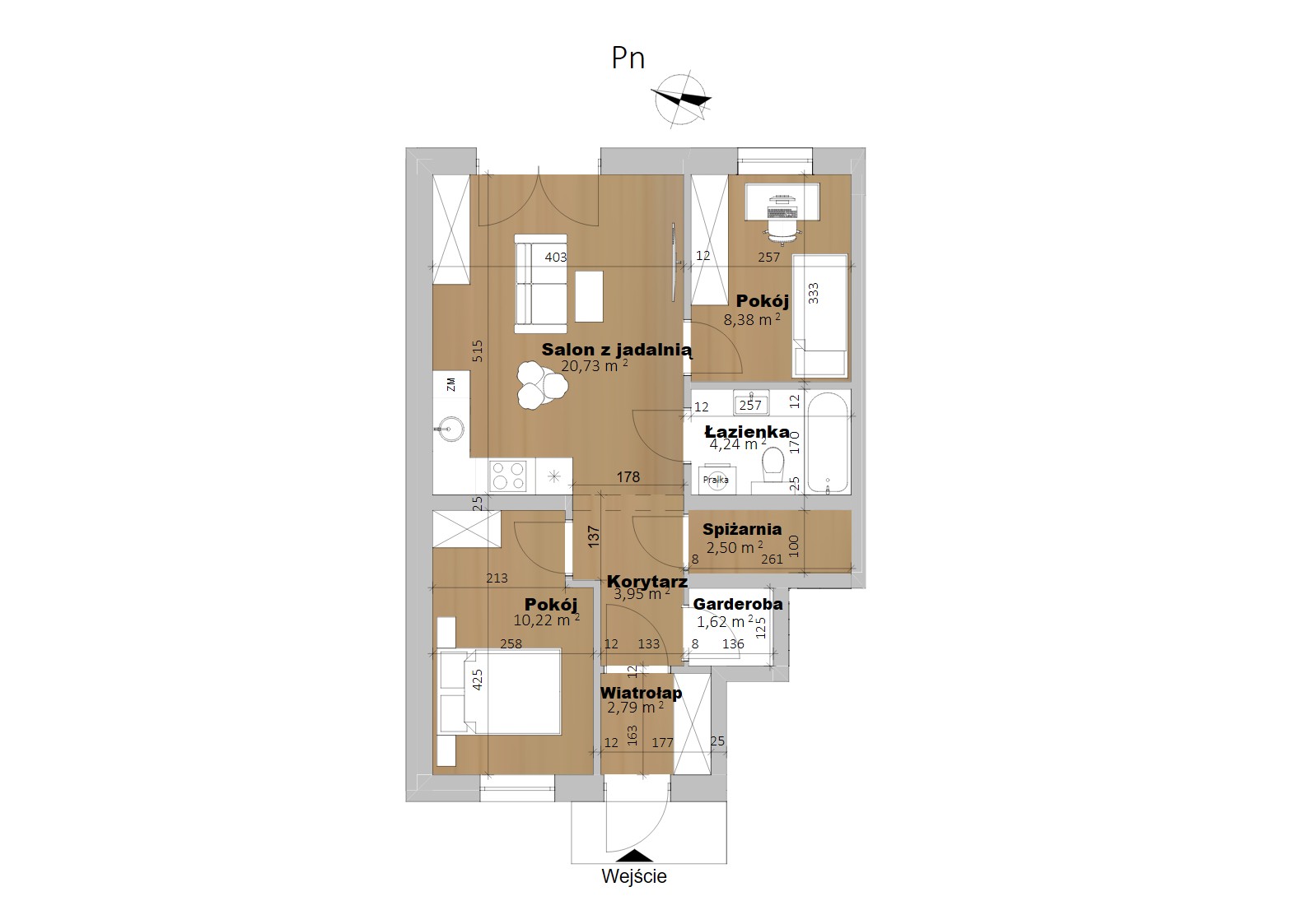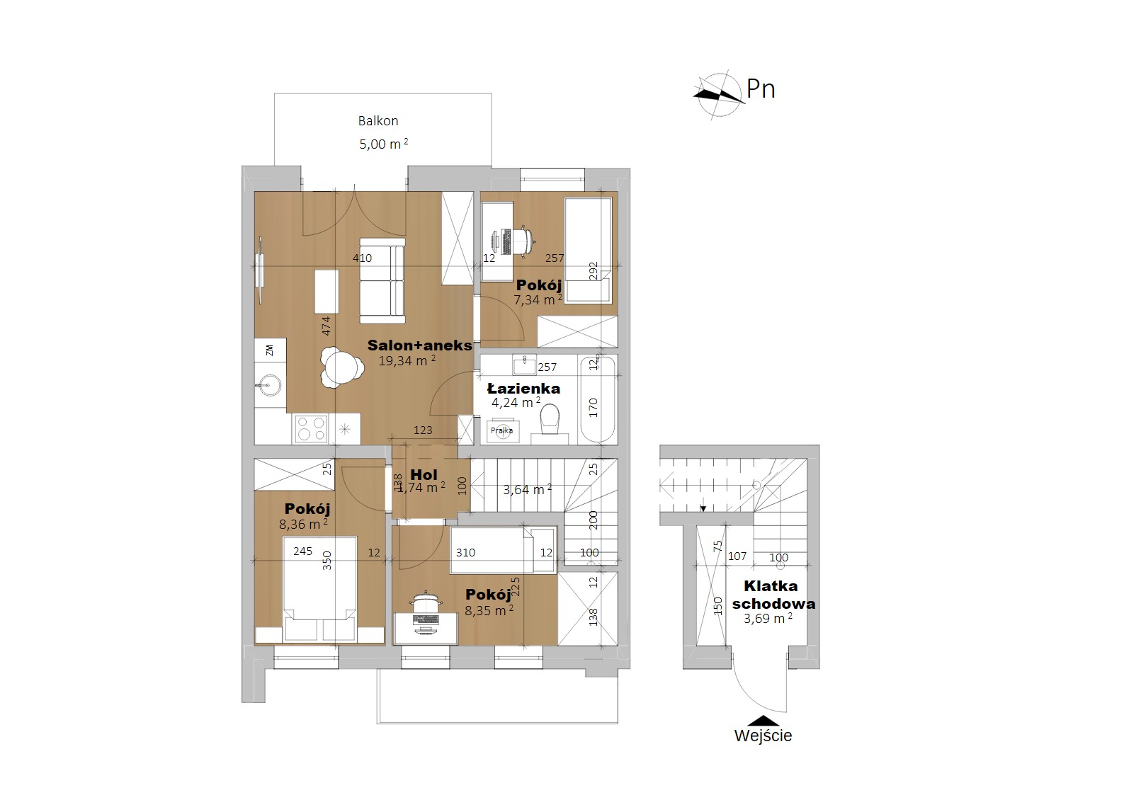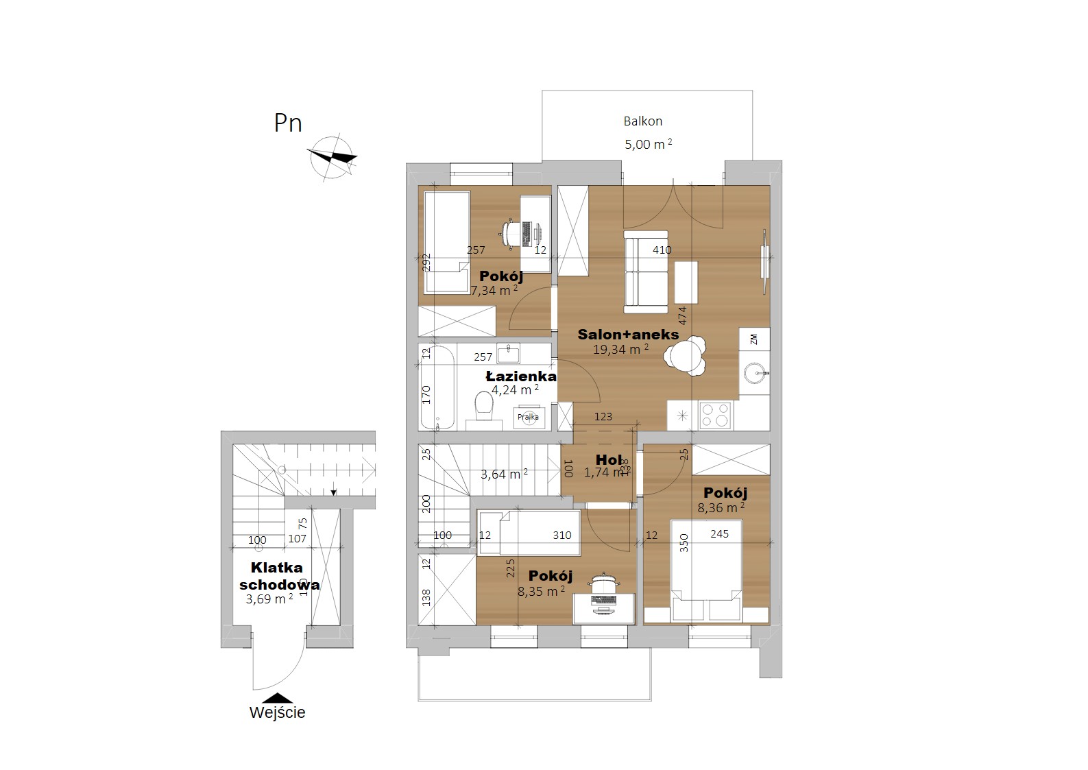 • możliwość elastycznej zmiany układu pomieszczeń z 4-pokojowego na 3-pokojowy