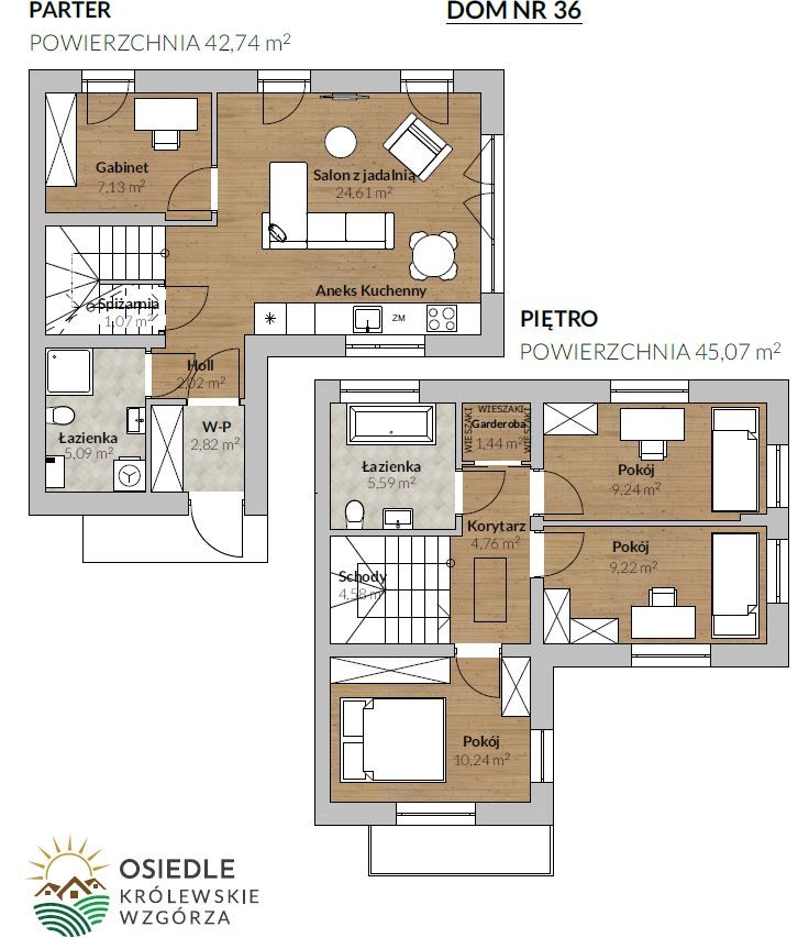 Parter Powierzchnia: 42,74 m2 Piętro I Powierzchnia: 45,07 m2 Kliknij na rzut, aby powiększyć |